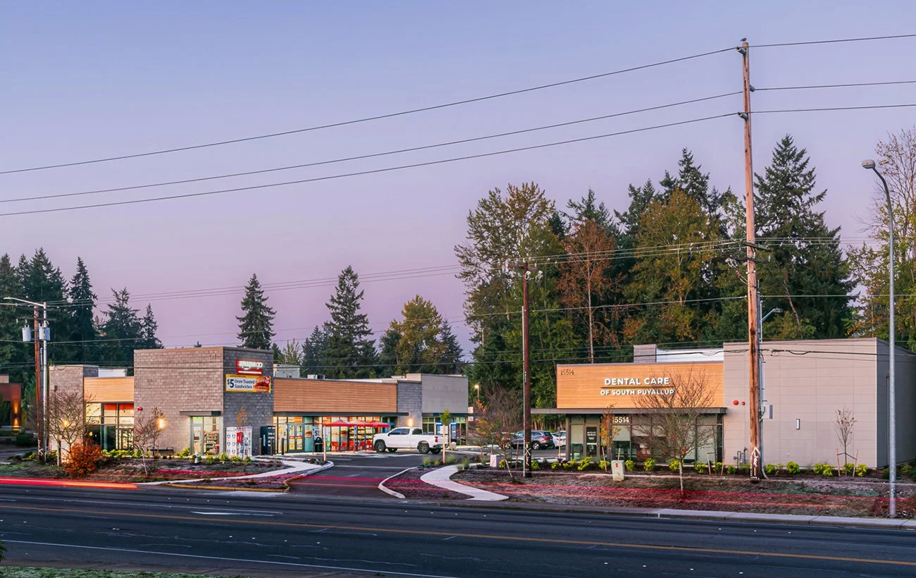 Mountain built two new wood framed single-story shell commercial buildings on a prime retail corner of Meridian and 156th St. The buildings have been occupied by Amazon Go and Dental Care of South Puyallup. The buildings are modern but warm and inviting. With low maintenance features included charcoal ground faced masonry block, prefinished siding panels and lap siding to look like stained wood. Generous steel canopies at the building walkways and a lot of storefront glass. Other features include new asphalt parking lots, car chargers, robust trash enclosures with matching features, beautiful landscaping, well-designed underground storm system and a new City sidewalk along 156th street.